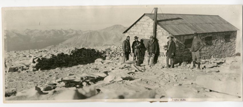 Panorama photograph of five men on the summit of Mt. Whitney next to the Smithsonian hut/shelter. Photo by Frasher #7-550. Billy Parcher, Willy Chalfant, George Diebert, Burton Frasher Sr., and unknown.
