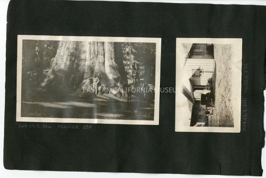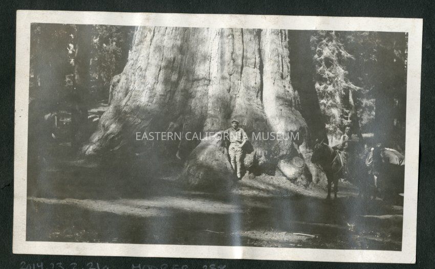 Two men posing next to a giant sequioa. One is leaning against the tree trunk and the other is mounted on a horse to the right of the photo.