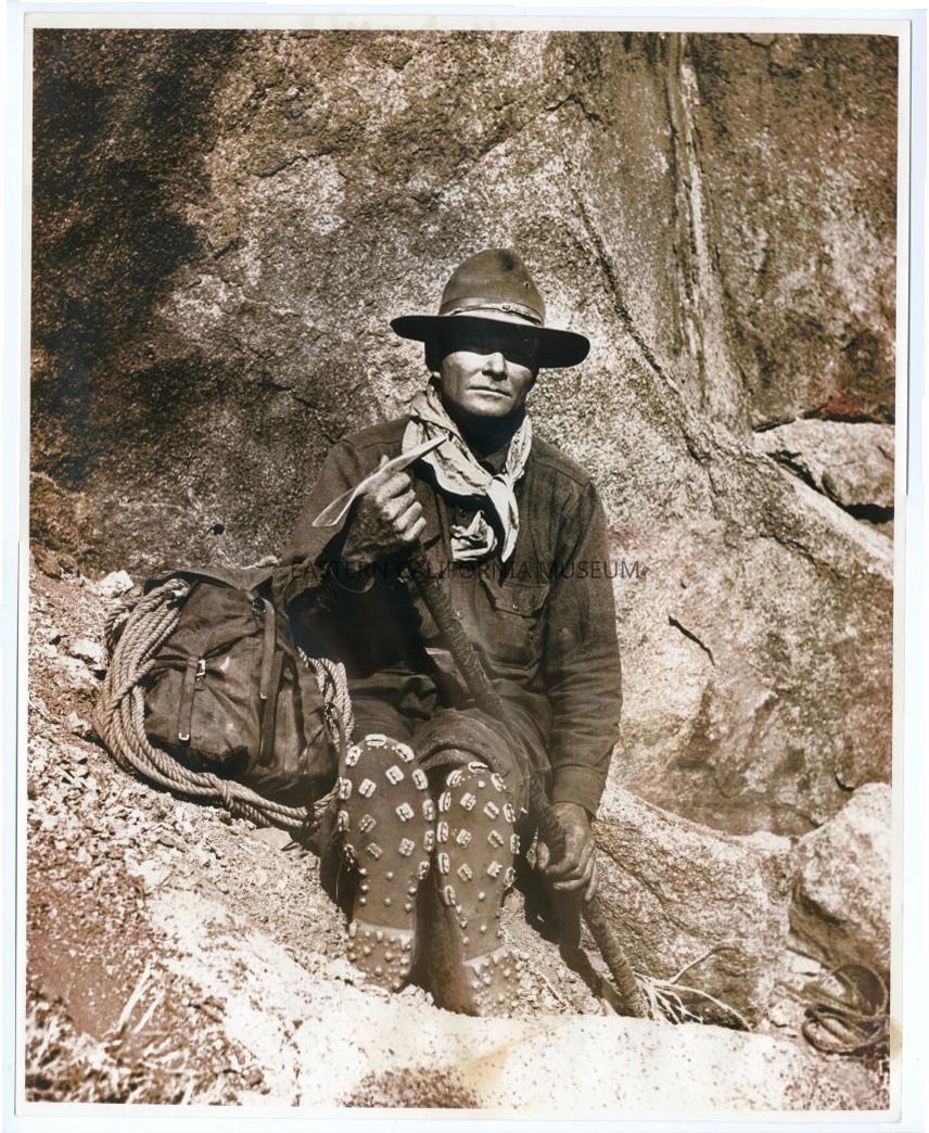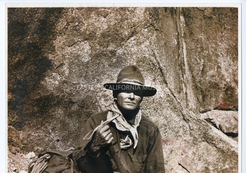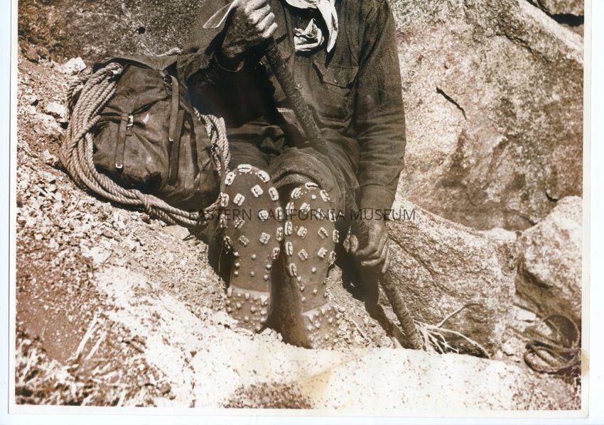 Enlarged photo of Norman Clyde sitting down or resting against a rock with his ice axe in his hands. Pack, rope, hat, scarf or bandanna around his neck, and metal bits on the soles of his boots.
