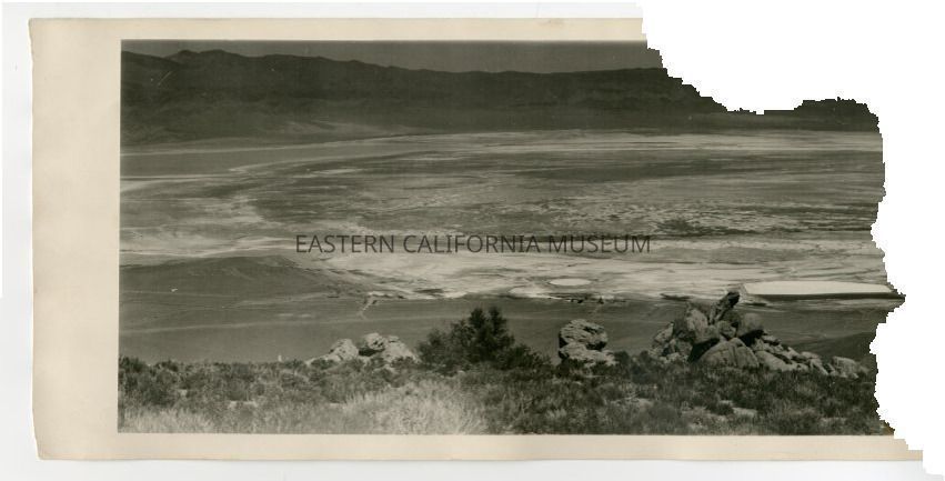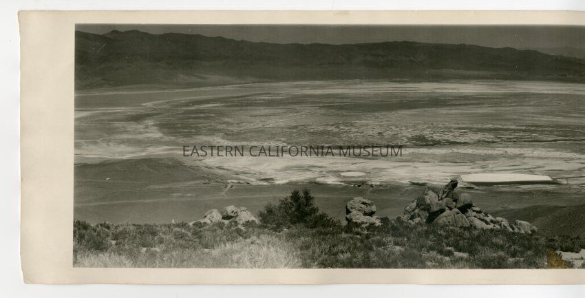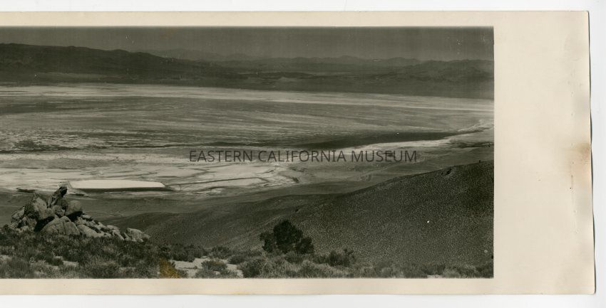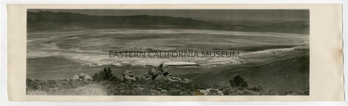 Panorama photo taken from a high vantage point of the Owens Lake. "R803" written on reverse, so likely a Ramsey photo.