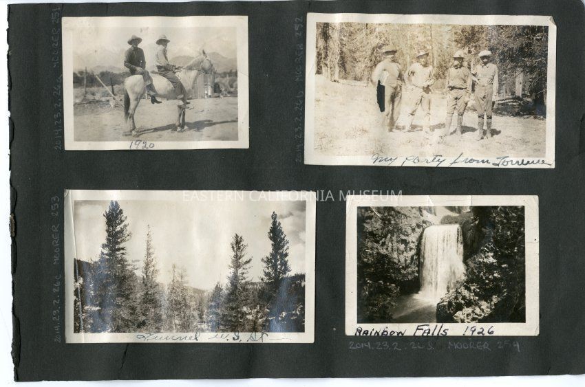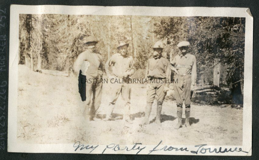 A handwritten caption says, "My party from Torrence." Photo is of four unidentified men standing in a forest. There is a tear in the middle of the photo.Collection