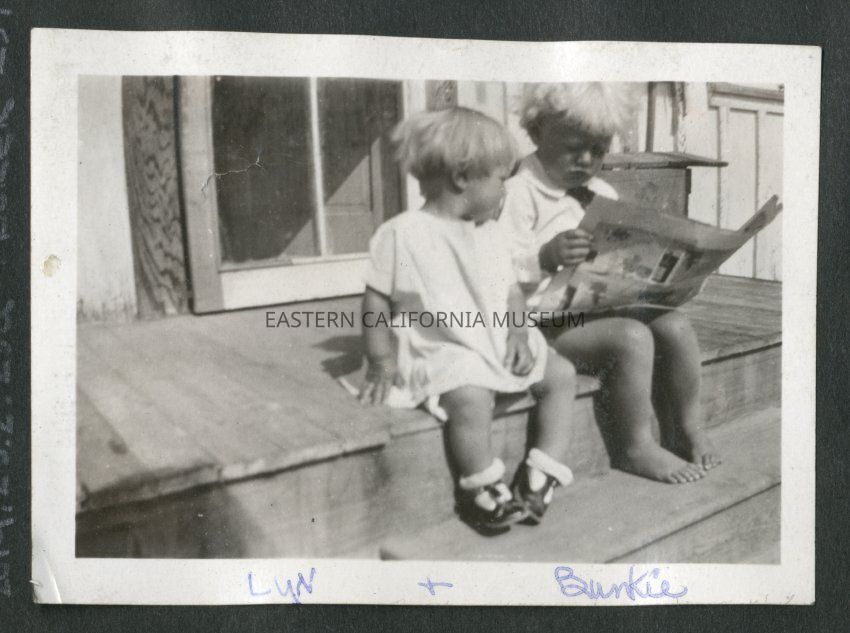 Two children sitting on the step of a front porch. The one of the right is reading a newspaper. Handwritten caption identifies them as "Lyn and Bunkie."Collection