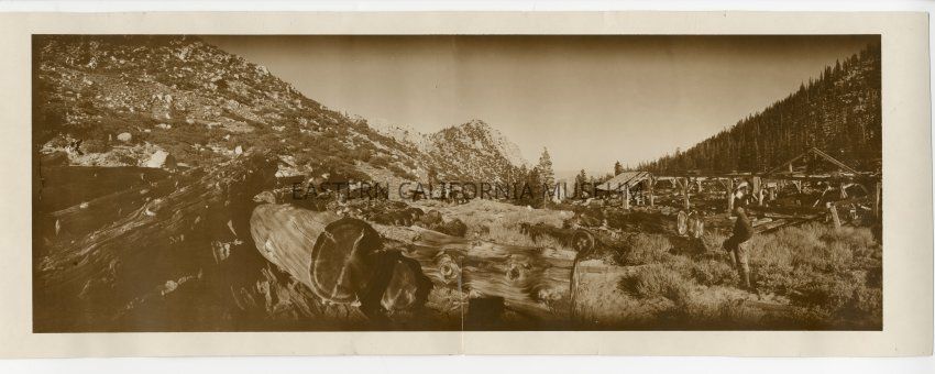Panorama photo of the remains of the Cottonwood Sawmill. There are two people in the photo: a man standing towards the right and a young man sitting on a log near center. They might be Ramsey and his son? "R3419" written on reverse, so likely a Ramsey photo. A few areas taped on the back, middle center is torn.