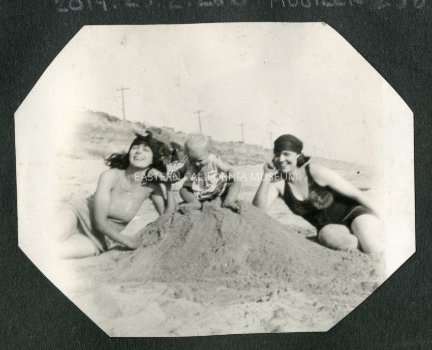 Photo of two women and a baby at the beach. The baby is sitting on a pile of sand. Woman on right is same woman seen in MOORER 216.