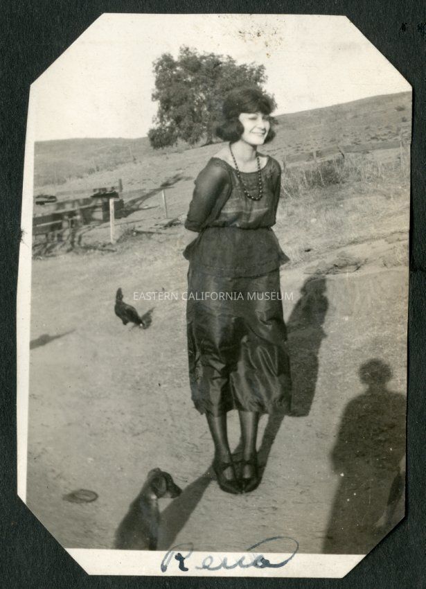 Rena Beth Moore with a puppy at her feet and a chicken in the background. Wearing a black dress and black bead necklace. Costume?