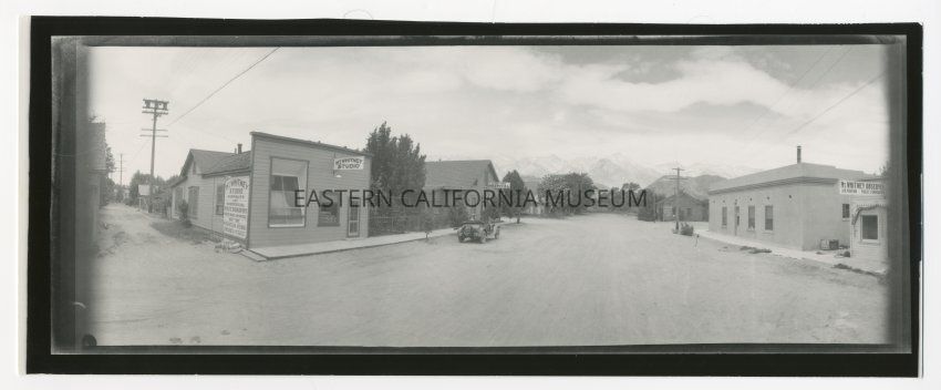 Copy of a photo of Bush Street in Lone Pine showing the Mt. Whitney Studio (Ramsey's studio) and the Lone Pine Hospital, which was run by Mrs. Ramsey. The sign on the side of the Mt. Whitney Studio says, "Mt. Whitney Studio / Portraits and Commercial Photography' Views Made Anywhere Any Time / Mountain Views / Kodaks for Sale." The Mt. Whitney Observer is visible in the lower right corner and a shoe shop is visible in the distance. The building on the right side behind the Mt. Whitney Observer may be a Sheriff's Station. Car parked on side of road. Sierra Nevada in background. Photo is likely a Ramsey.