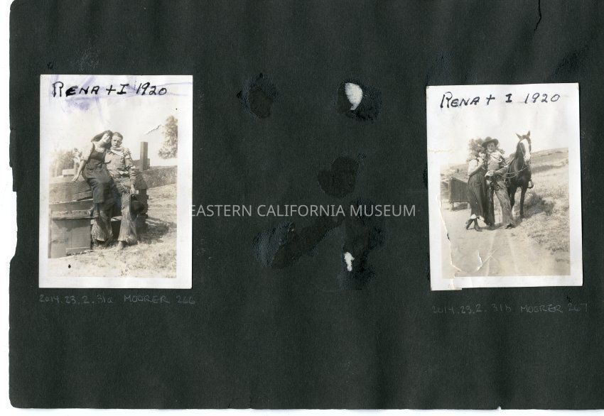 Fred Moore wrote the caption on this photo, "Rena and I 1920." Photo of Rena Beth Moore and Fred Moore posing together. Fred is holding the reigns of a horse with his other arm around Rena's shoulders. Fred is wearing chaps. Photo has been substantially damaged and torn.