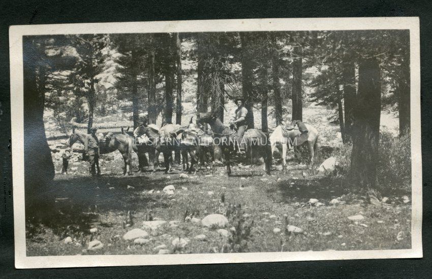 Photo of a group of pack animals and packers in a forest. Man mounted on horse in center may be Fred Moore.