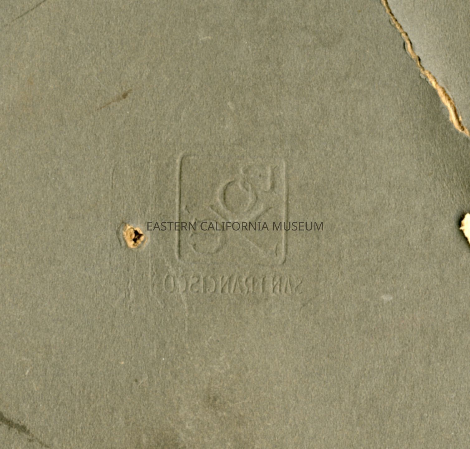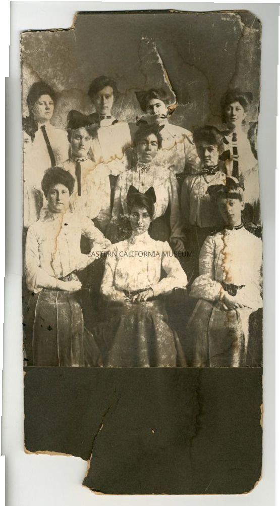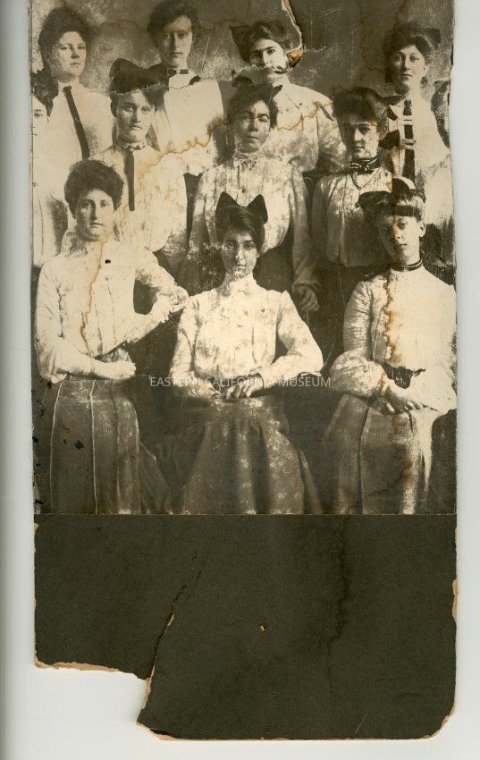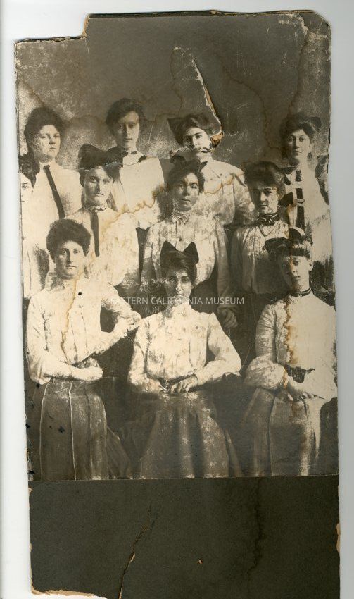 Mounted oversize photo in very poor condition of a group of ten (and a half on the left side) women, all wearing white shirts with long skirts. Several have large bows in their hair and a couple have neckties. There is a logo that says "San Francisco" stamped in the back of the mounting board, but otherwise no identification. Water damage, puncture in middle of photo, top left corner missing, lower left corner of mounting also missing.