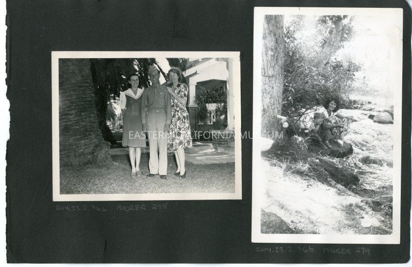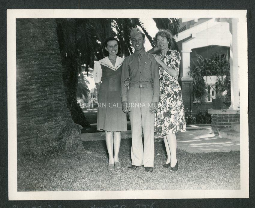 Two women posing with a young man in uniform in front of a house. Based on the vegetation, I would say this photo was taken in Southern California and not in Inyo County. Photo looks to be taken at a later time than the rest of the photos in the album.Collection