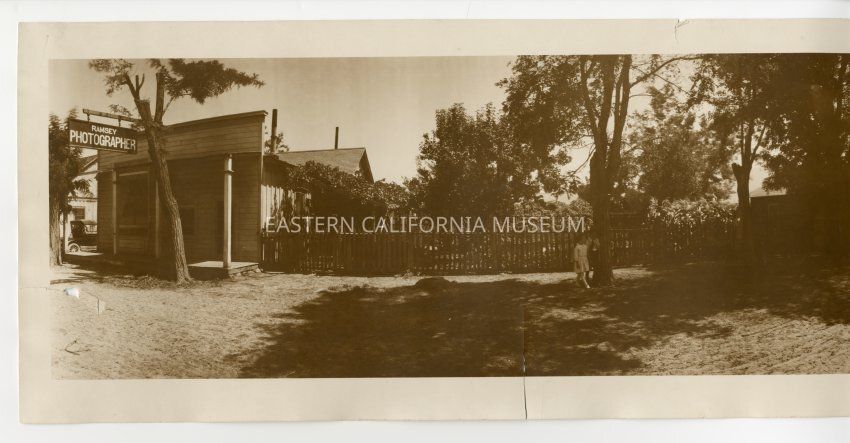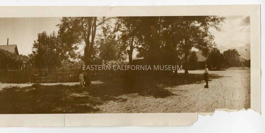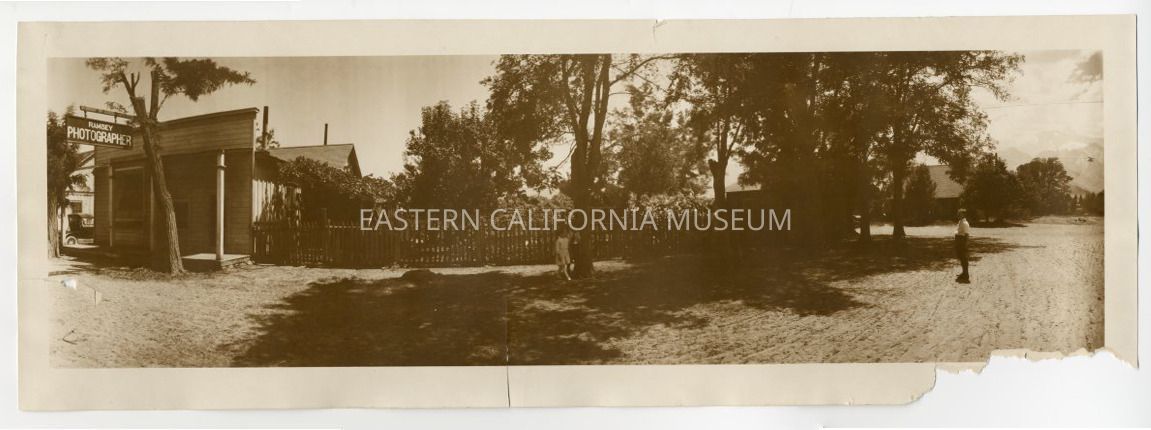 Panorama photo of the Ramsey Photography studio on Bush Street in Lone Pine. A man is standing in the middle of the dirt road (Mr. Ramsey?) and there are two children, a boy and a girl, standing beneath a tree (the Ramsey children?). There appears to be a vehicle parked on far left side (Model T?), and the Sierra Nevada mountains are visible to the right side. The photo shows a picket fence and trees where the Lone Pine Hospital would later be built. Likely a Ramsey photo.