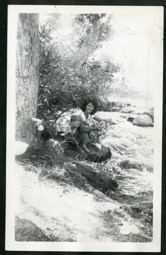 Appears to be Rena Beth Moore and young child (Lyn or Bunkie?) sitting on a boulder in a stream or creek.