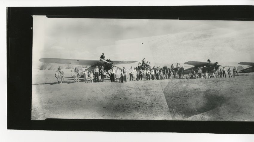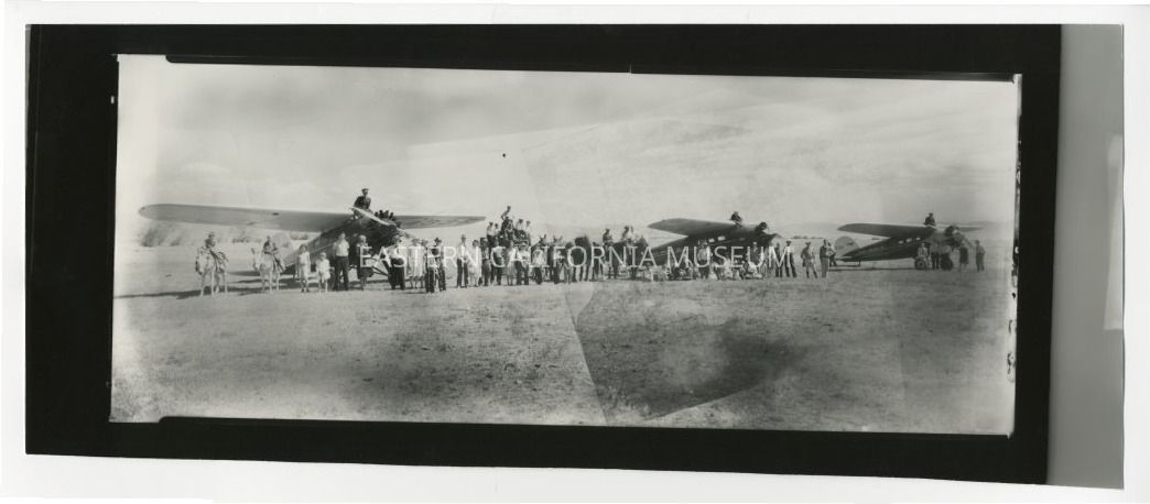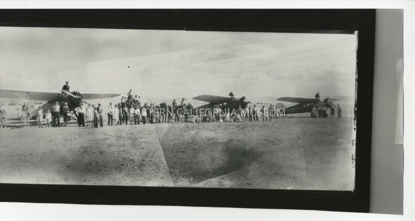 Copy of a panorama photo of three airplanes, a wagon, horses, and people in a field. Photo appears to have been pieced together from various negatives as there are odd lines and differences in lightness/darkness throughout the photo. The planes say, "Nevada Airlines Inc."