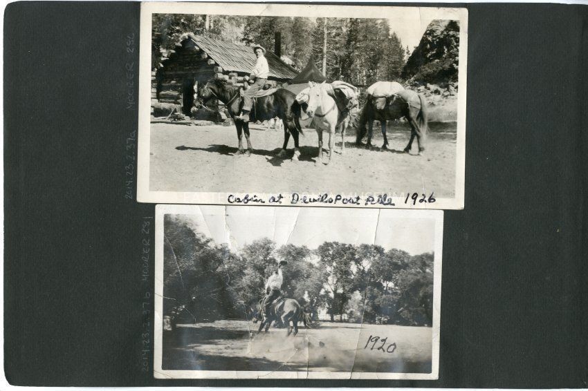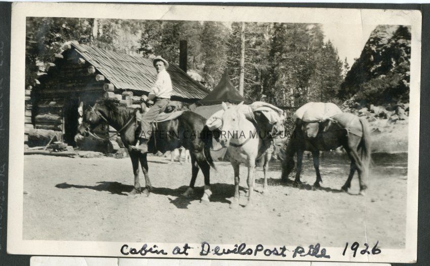 Fred Moore mounted on a horse leading two other pack animals. Log cabin in background. Handwritten caption says, "Cabin at Devils Postpile."
