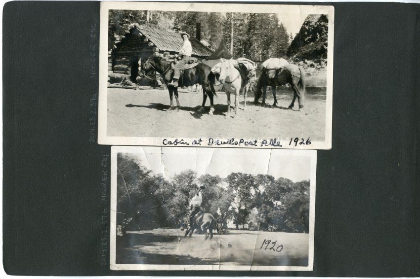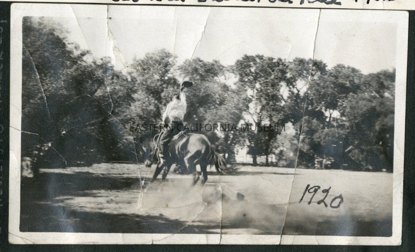 Fred Moore riding a bucking black horse in the traditional pose with his hat held in one hand above his head. Similiar to MOORER 150.