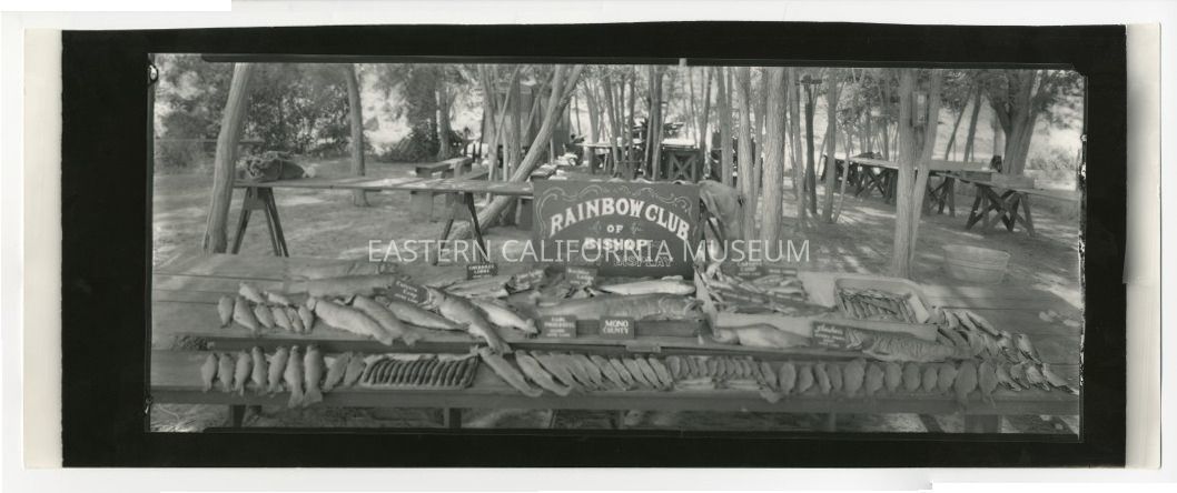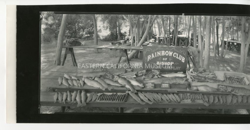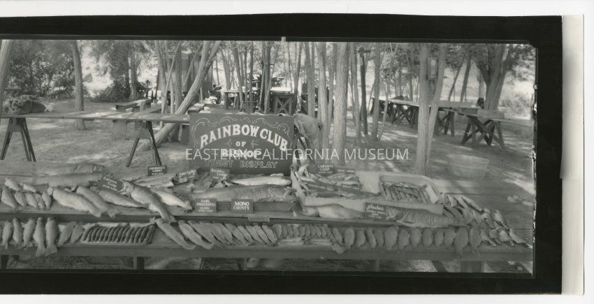 Copy of a panorama photo of a display of trout with a sign saying, "Rainbow Club of Bishop Trout Display." Smaller signs/labels include "Culvers Camp, June Lake," "Cherokee Lodge, June and Gull," "June Lodge, June Lake," "Boulder Lodge, June Lake," "Earl Proebstel, Guide, June Lake," "Mono County," "Carsons Camp, Silver Lake," " Rush Creek," "Silver Lake," "Grant Lake," and "Frasher's Sierra Photo Shop, June Lake."