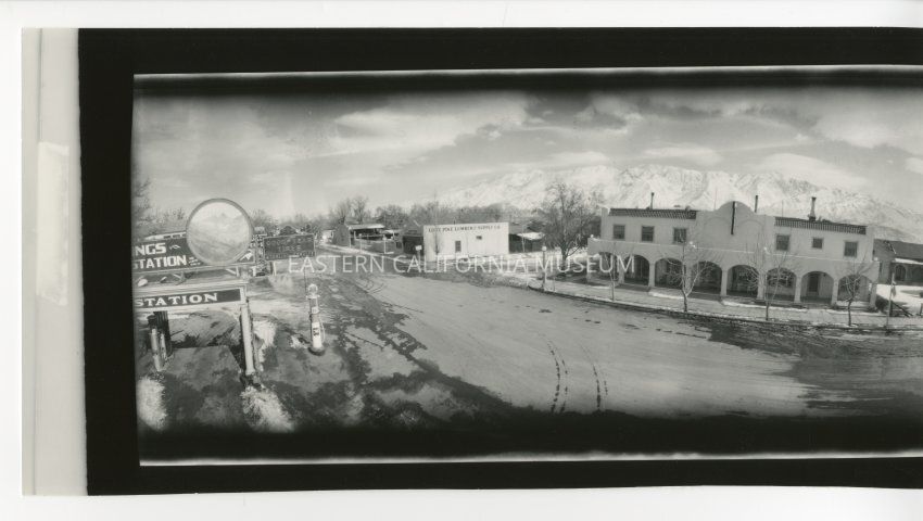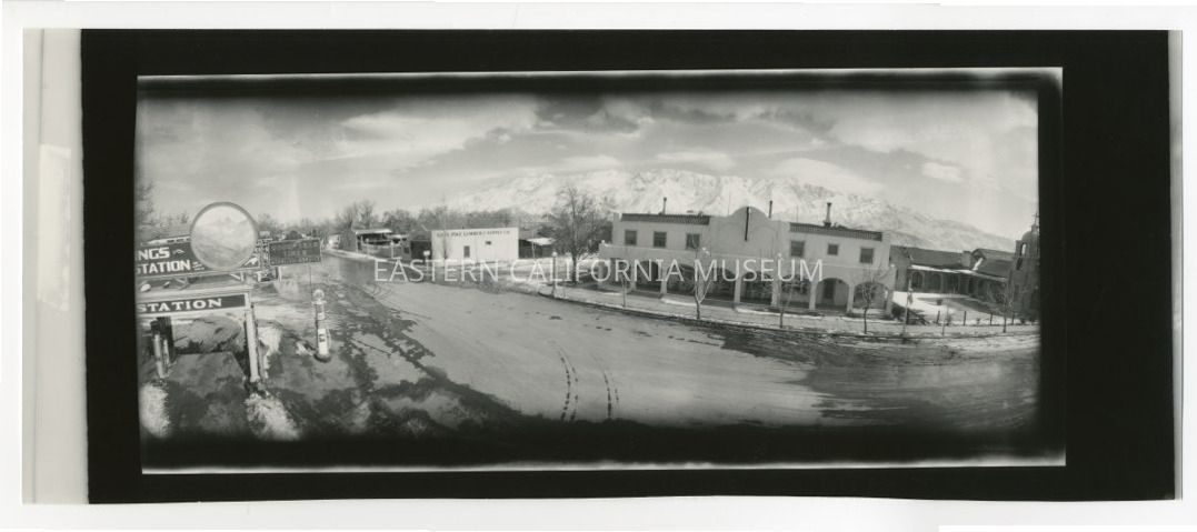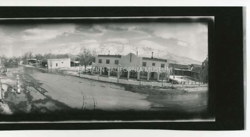 Copy of a panorama photo of the Dow Hotel in Lone Pine taken from a high vantage spot (top of a building?). The Santa Rosa Catholic Church is visible to the right while the Lone Pine Lumber and Supply Co. is visible to the left. A sign for gas (76 Station) and Goodyear Tires is also visible to the left as well as a sign that says "See Mt. Whitney Close Up." There is a little snow on the ground and either ice or melting snow (water). The mountains behind the Down Hotel (the Inyo Mountains) appear to be covered in snow.