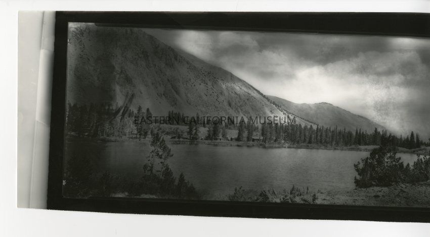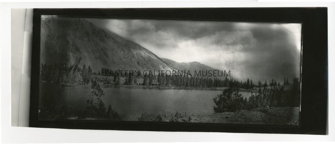 Copy of a panorama photo of a lake surrounded by trees and a mountain. It is very dark--maybe an issue with the negative or development? Written in pencil on reverse, "Big Pine Lakes?"