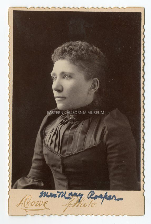 Mounted photograph of Mary Hitchcock Roeper, who was married to Julius Roper. Someone has written "Mrs. Mary Roeper" in ink (which has bled) under the photo. The mounting has scalloped, gilt edges.