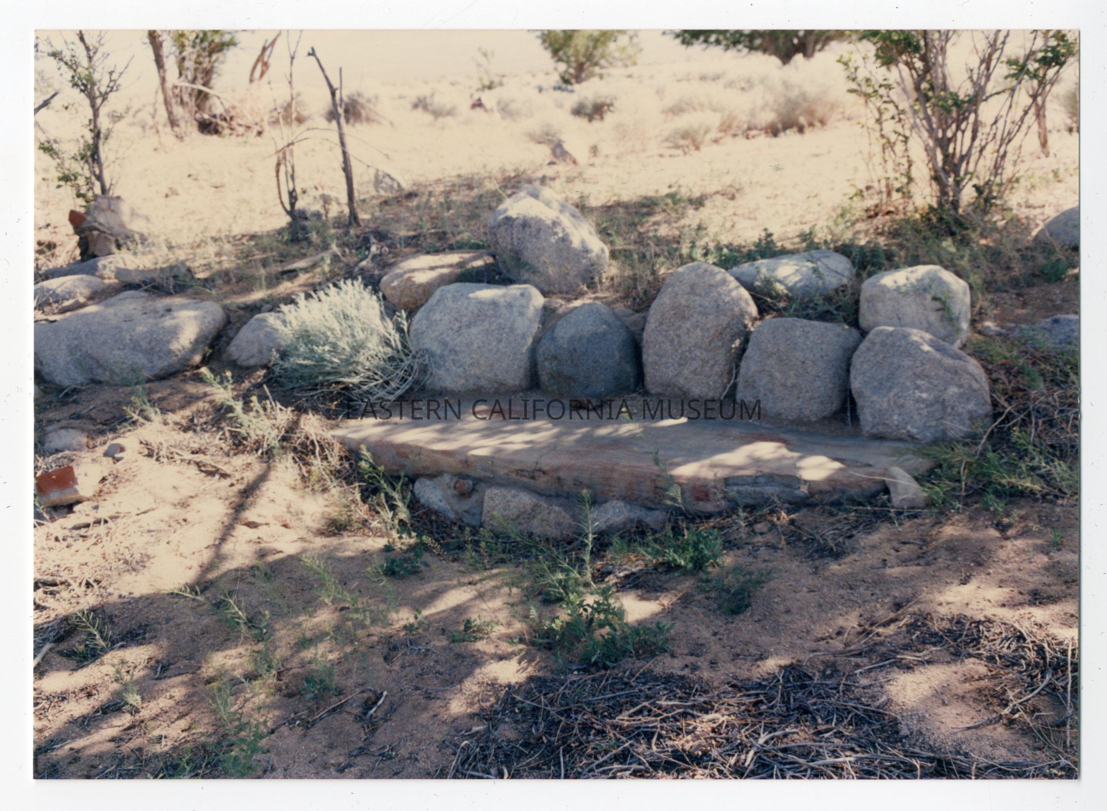 Color photo of a platform (appears to have been painted red?) and a border or large rocks.