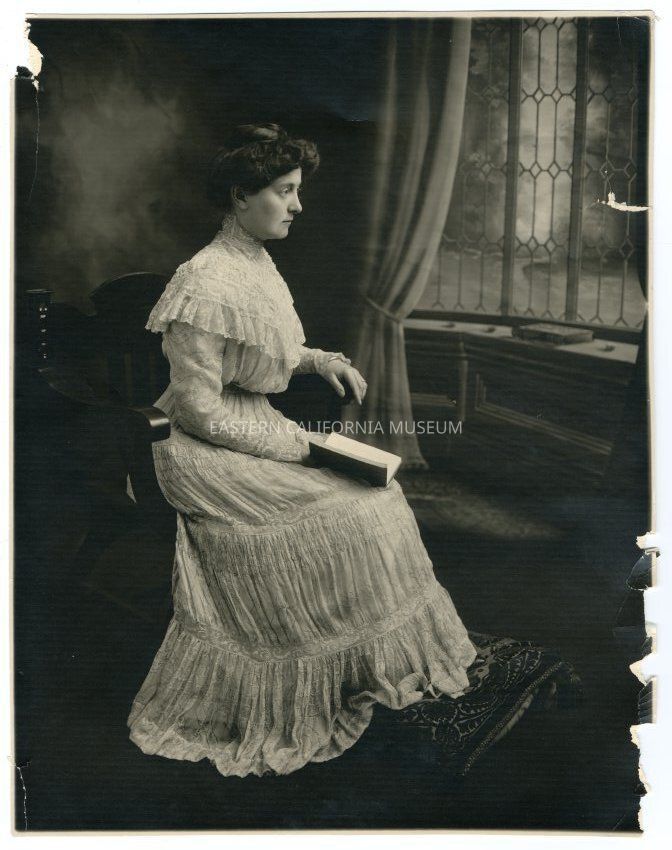Large studio portrait of Annie Ramsey, the wife of photographer Allen Ramsey. She established the first hospital in Lone Pine from 1927 to 1943. She is sitting in a chair with an open book on her lap.Collection