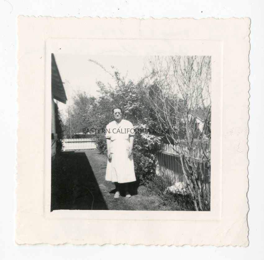 Information from accession paperwork: Photograph of Elma Parker Stone, May 23, 1950, the daughter of J. E. Parker of Chalfant and Parker, who rescued the flag that lay in the street when the second courthouse burned in 1886. Elma Parker Stone passed away in Bishop in 1956, and her sister is the donor.Collection