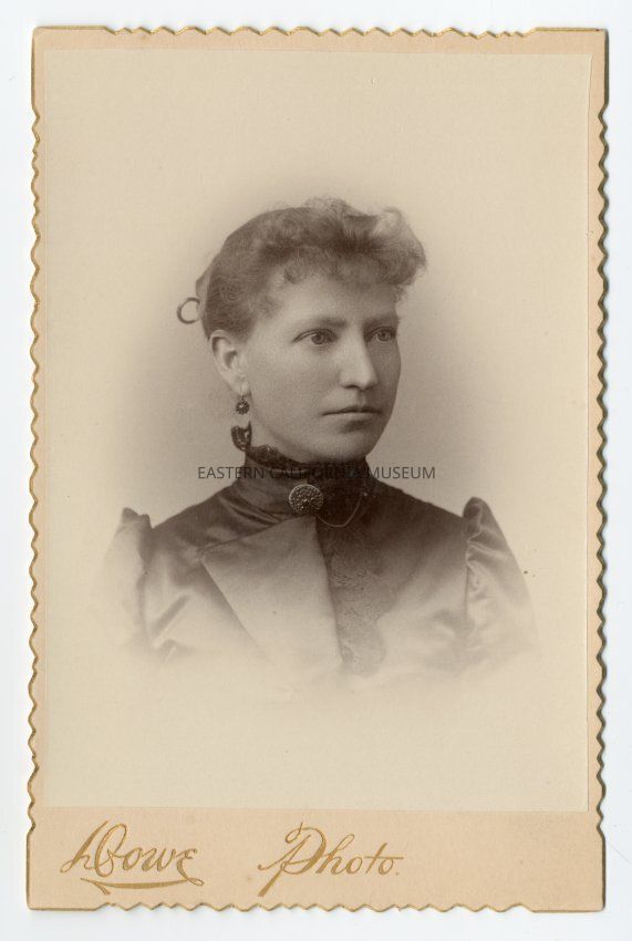 Mounted studio portrait of Minnie Uhlmeyer before her marriage to Dan McPhail. The edges of the mounting are scalloped and gilt. Photographed by Dowe.Collection