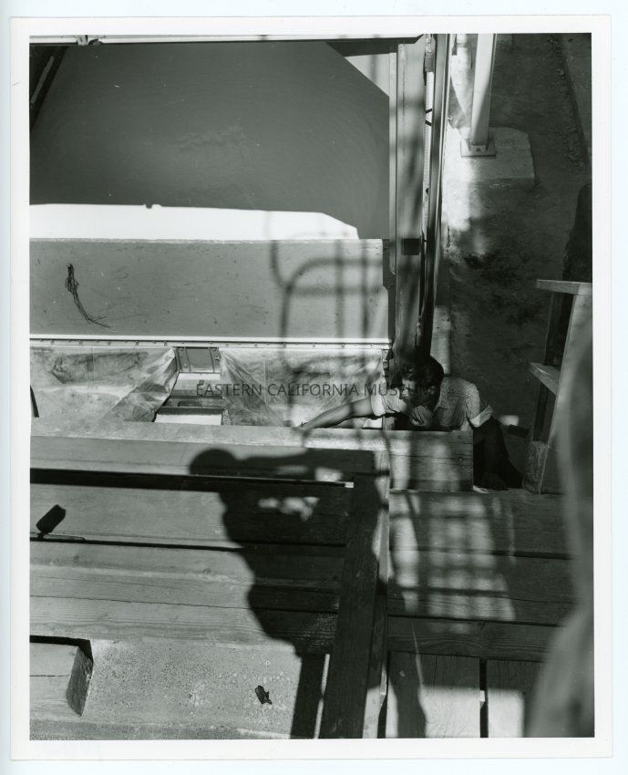 Photo of a man [maybe Al Aigner?] wearing a shirt with rolled-up sleeves and gloves reaching towards something amidst wood, concrete, and metal building foundations. He is likely an employee of the Southern Pacific Truck Service at the Union Carbide Pine Creek Mine or Mill.