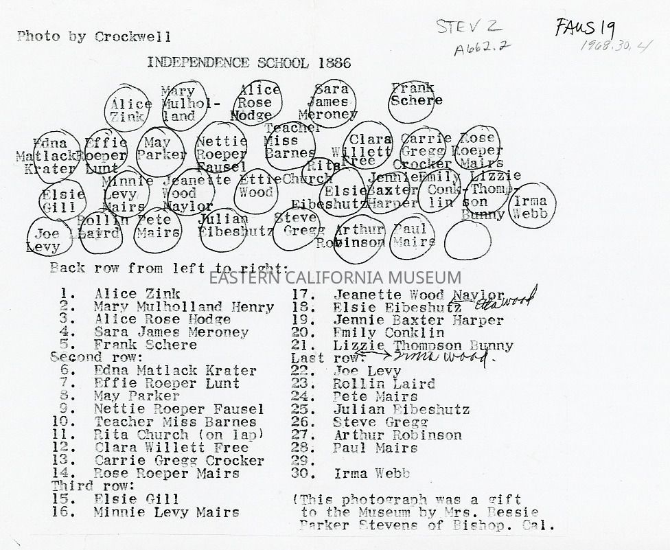 There is a separate piece of paper with the photo titled "Independence School, 1886, photo by Crockwell" and it lists many of the names of the children in the photo. They include: Alice Zink, Mary Mulholland Henry, Alice Rose Hodge, Sara James Meroney, Frank Schere, Edna Matlack Krater, Effie Roeper Lunt, May Parker, Nettie Roeper Fausel, Miss Barnes (teacher), Rita Church (on the teacher's lap), Clara Willett Free, Carrie Gregg Crocker, Rose Roeper Mairs, Elsie Gill, Minnie Levy Mairs, Jeanette Wood Naylor, Etta Wood, Elsie Eibeshutz, Jennie Baxter Harper, Emily Conklin, Lizzie Thompson Bunny, Irma Wood, Joe Levy, Rollin Laird, Pete Mairs, Julian Eibeshutz, Steve Gregg, Arthur Robinson, Paul Mairs, and Irma Webb.Made/Created