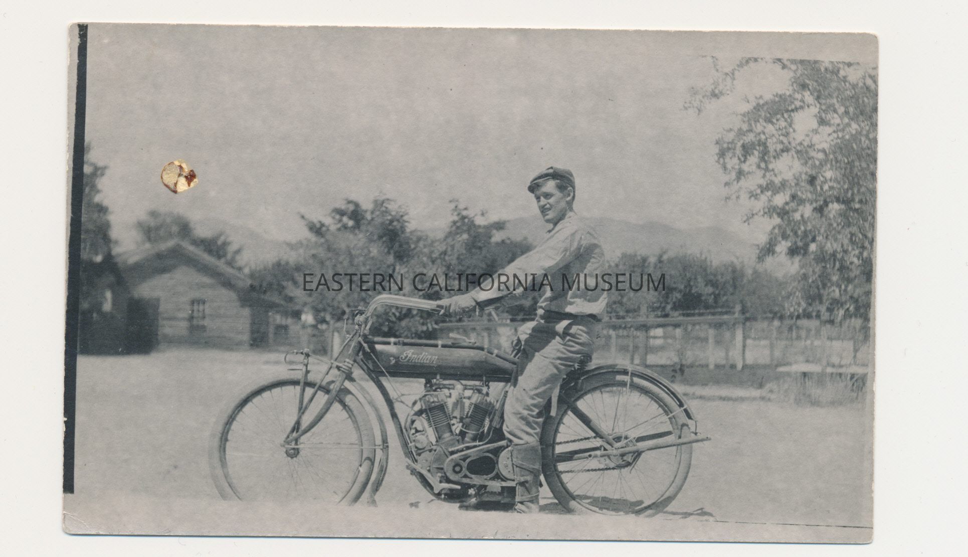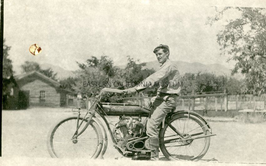 Photo postcard of a young man identified as Edward "Ed" Leahy on an Indian motorcycle. Leahy worked for LADWP in a number of capacities. He lived in the Owens Valley for a number of years and during the tumultuous 1920s was one of the City's representatives in dealing with the thorny issue of land and water rights acquisitions.