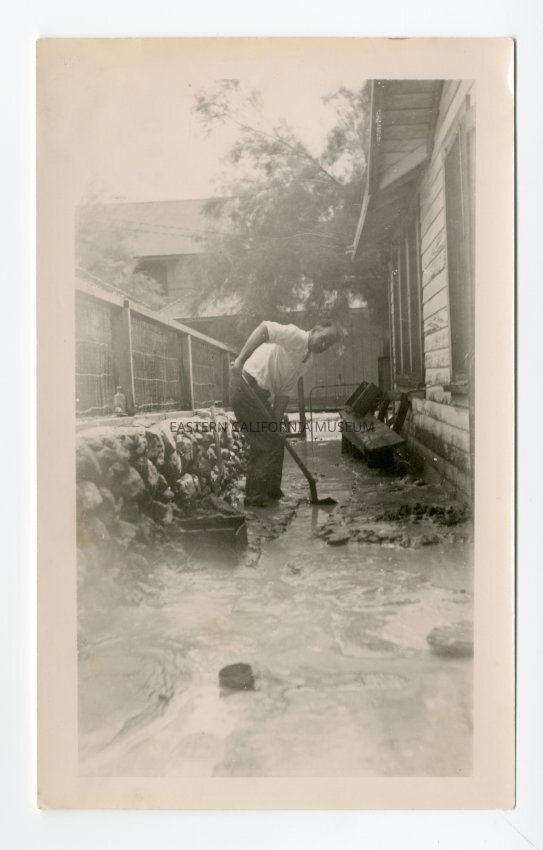 Photo of a man digging out mud and water with a shovel from between a building and a low rock wall. Event is likely the aftermath of the 1945 Keeler flood.