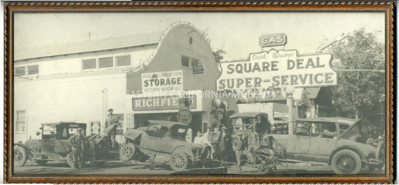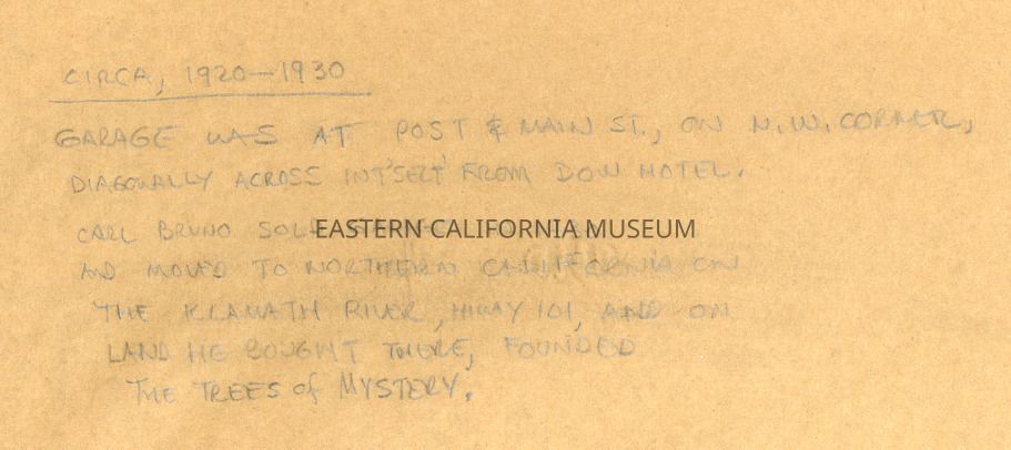 Written on the back: Circa 1920-1930. Garage was at Post and Main St. on the NW corner, diagonally across intersection from Dow Hotel. Carl Bruno sold garage in 1930 and moved to northern California on the Klamath River, Highway 101, and on land he bought there founded the Trees of Mystery.