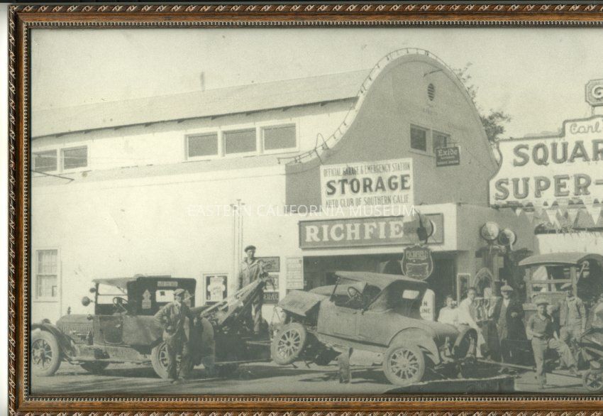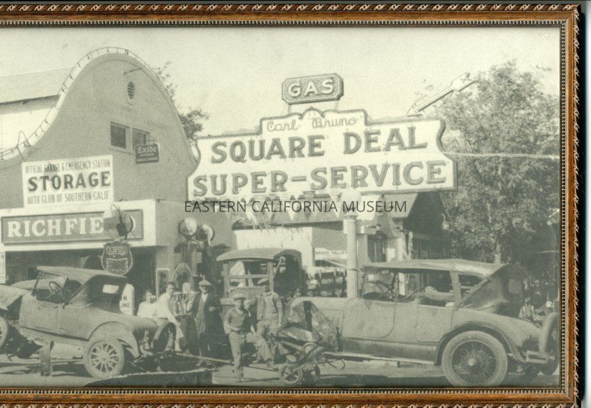 Framed panorama photograph of the Square Deal Super-Service garage in Lone Pine. Carl Bruno, the owner of the garage, is standing at left rear wheel of tow-truck.