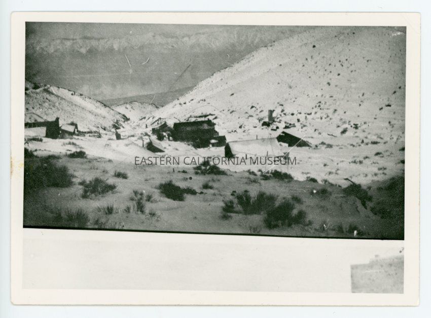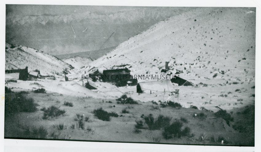 Copy of a photo of Cerro Gordo taken from a high vantage point looking down canyon towards Owens Lake and the Sierra Nevada. The town is covered in snow.
