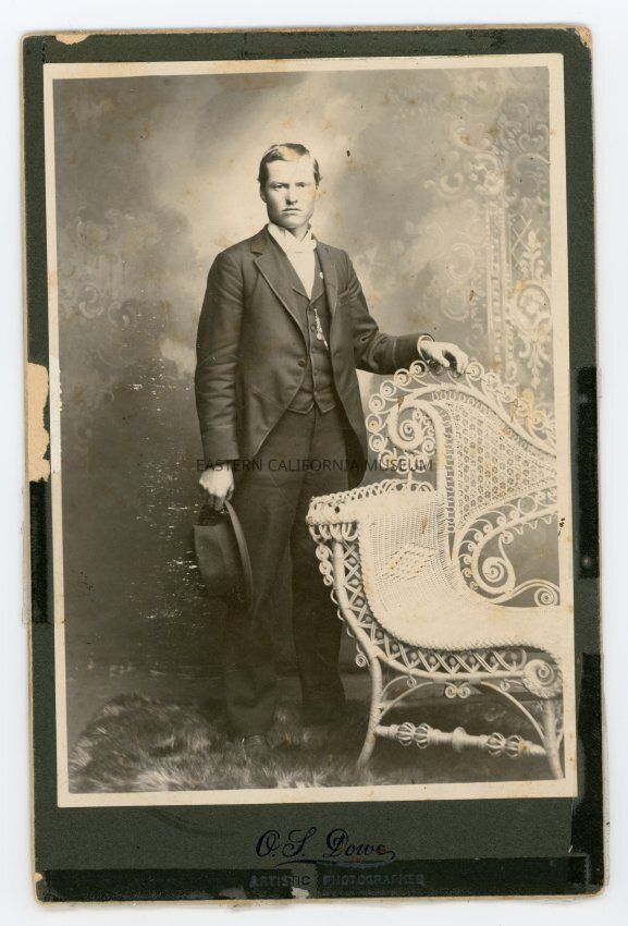 Mounted full-length studio portrait of a man. He is holding a hat in his right hand and rests his left hand on an ornate wicker chair. He is identified on the reverse as Jim Jenkins, born [Lone Pine is crossed out] Fort Independence, 1880. The photo was taken in 1899 and the photographer was O. S. Dowe.