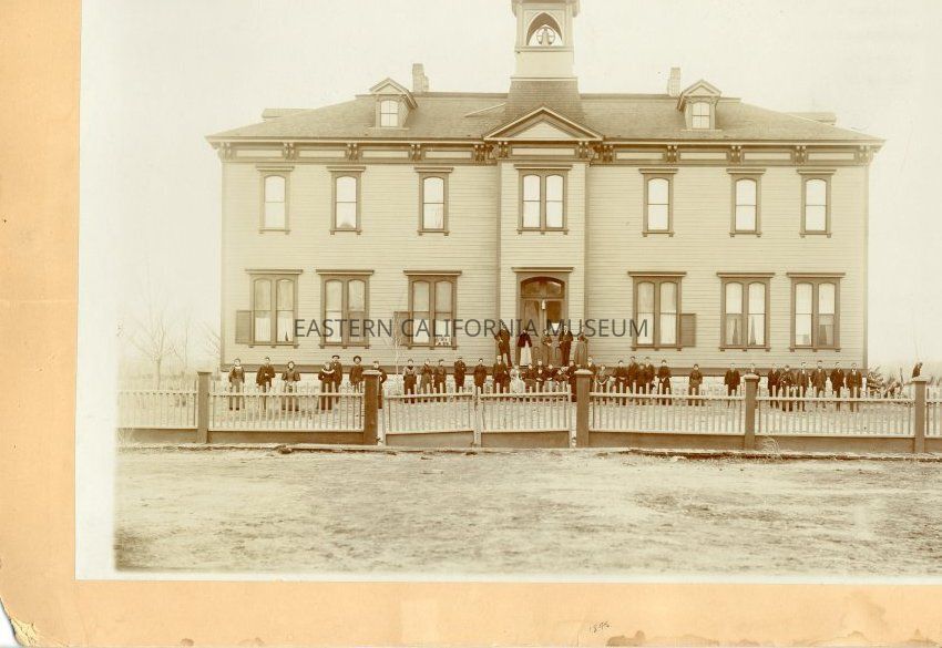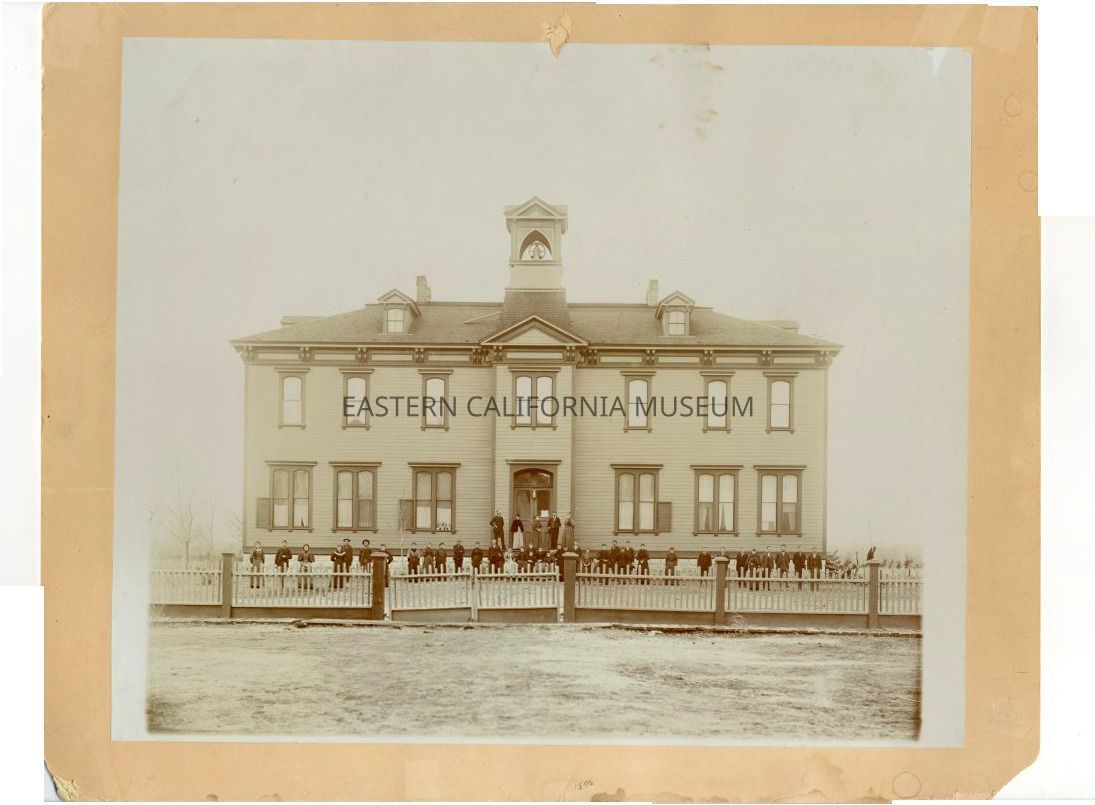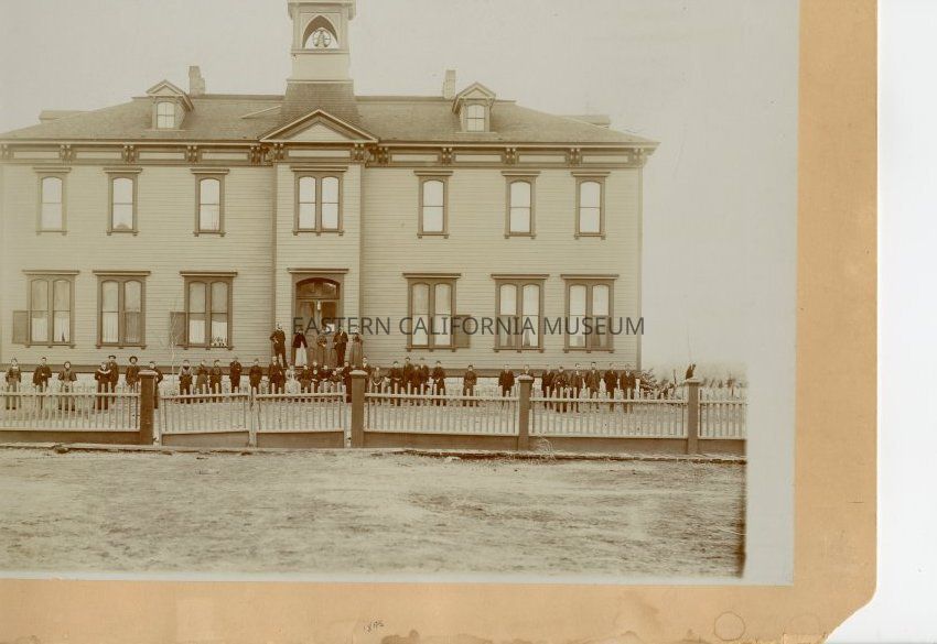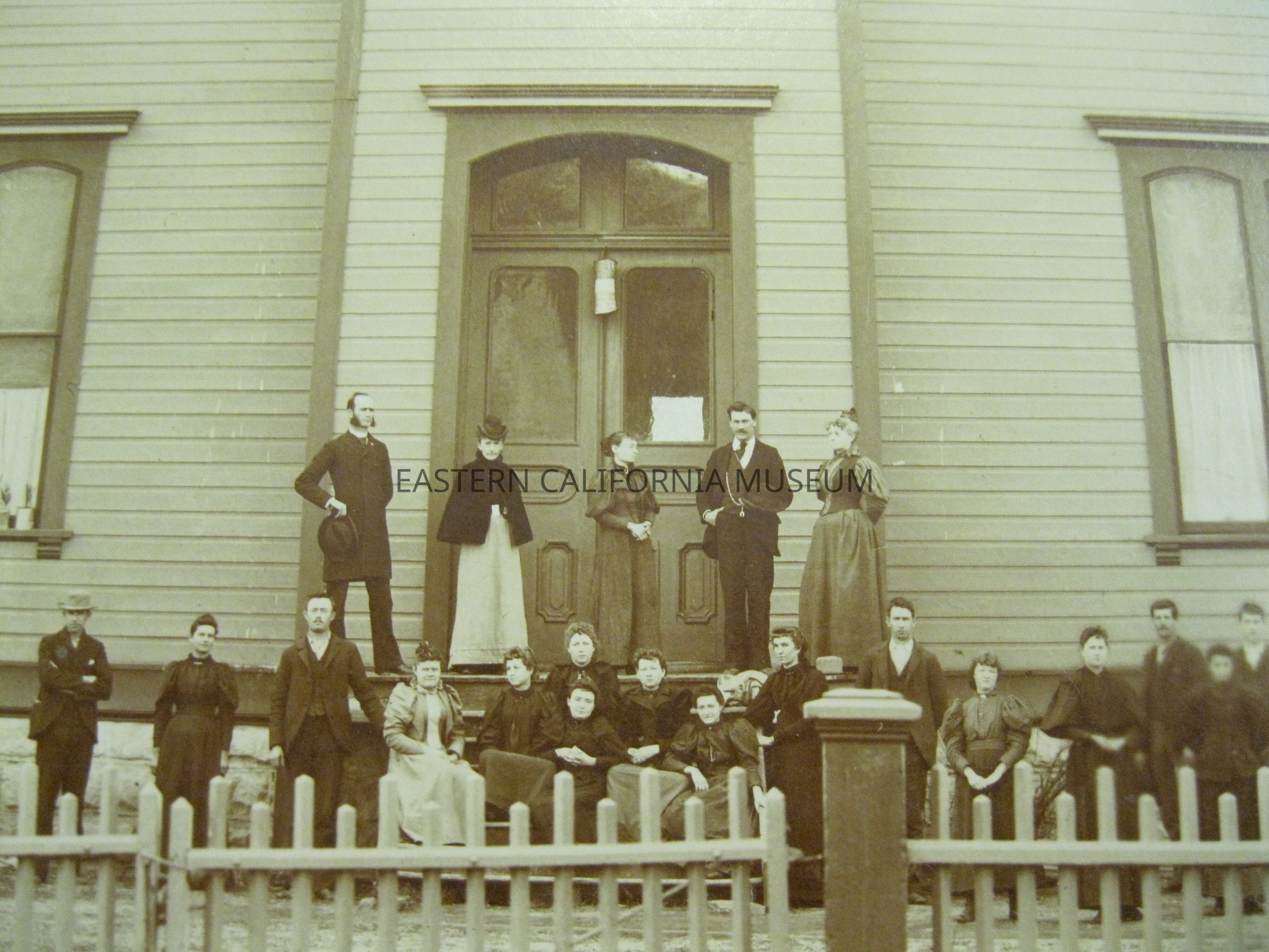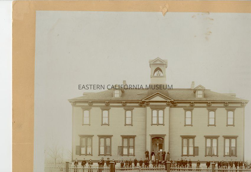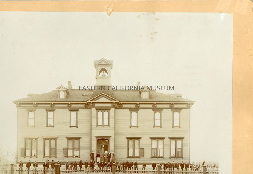 Mounted photo of Foster's Methodist Academy [Inyo Academy?] in Bishop, circa 1895. Five teachers standing on front porch of two story building, and Mary Austin, then a teacher, is standing in the center looking off to the right. There are students scattered across the yard. There is also a bell tower in the center of the building. Fence in front. There is a hole in the upper center of the photo.