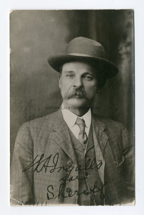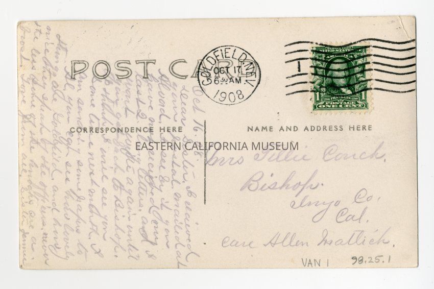Photo postcard sent to Mrs. Tillie Couch of Bishop, care of Hellen Matlick, from her sister, Jennie. It has a green one cent Benjamin Franklin stamp and is postmarked from Goldfield, NV on October 17, 1908. The image on the front of the postcard is a studio portrait of a man with "W. A. Ingalls for Sheriff" written at the bottom. It was likely a campaign advertisment. The body of the letter mentions Alvord and "how lively things are [in] Goldfield."