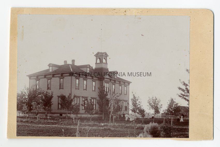 Mounted photograph of the Inyo Academy in Bishop about 1894.