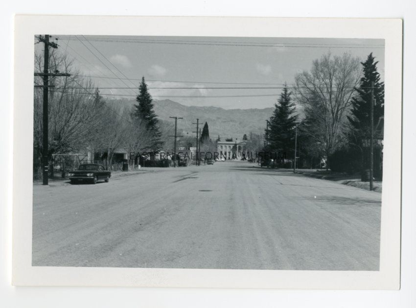 Small black and white photo of Center Street in Independence looking east toward the Courthouse. Photo taken from the site of the Eastern California Museum.Collection