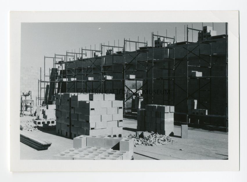 Small black and white photo of the Eastern California Museum building under construction. Lots of scaffolding and blocks used to form the structure.Collection