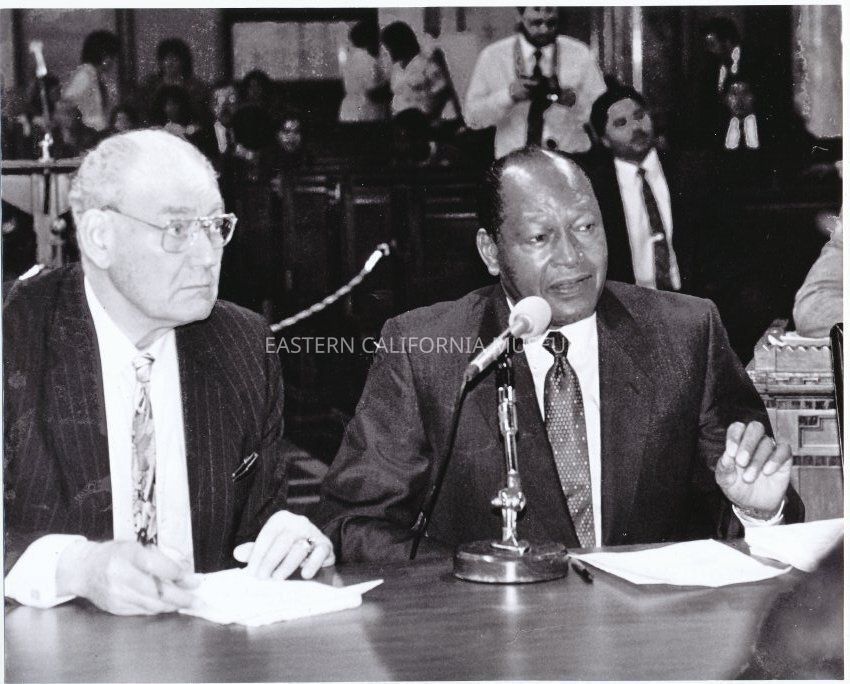 L to R: Los Angeles City Council member John Ferraro with Los Angeles Mayor Tom Bradley. Image is a black and white, grainy copy.