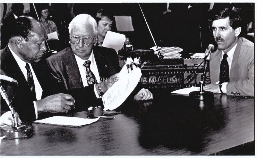 L to R: Los Angeles Mayor Tom Bradley, Inyo County Supervisor Keith Bright, and Inyo County Water Director Greg James. Image is a black and white, grainy copy.