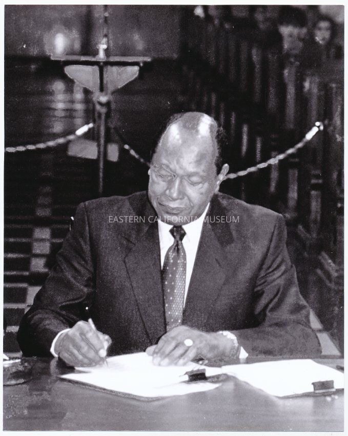 Los Angeles Mayor Tom Bradley signs the Long-Term Water Agreement. Image is a black and white, grainy copy.
