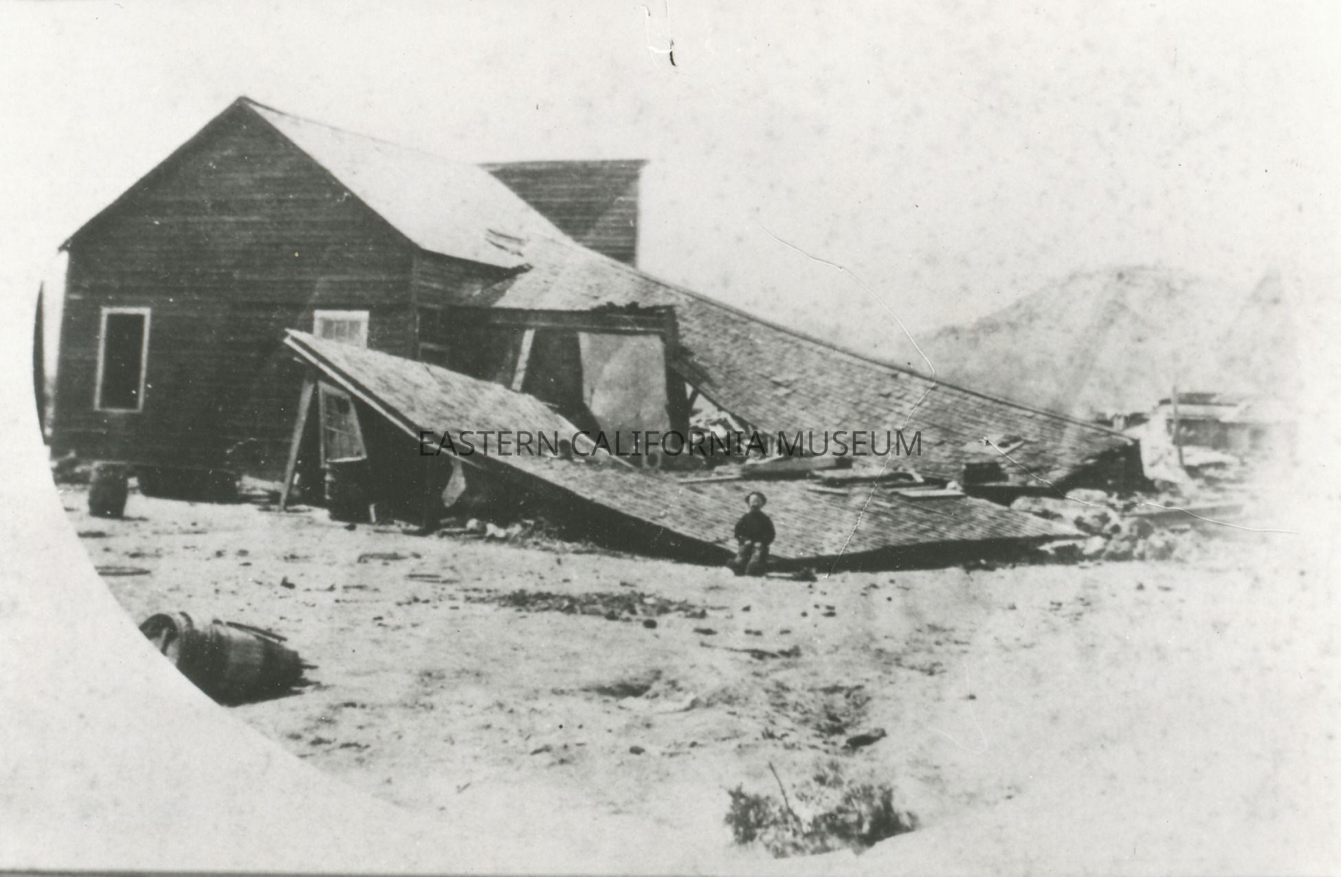 Damage done by the Earthquake of 1872. Photo shows collapsed house or business with a child sitting on the fallen roof.