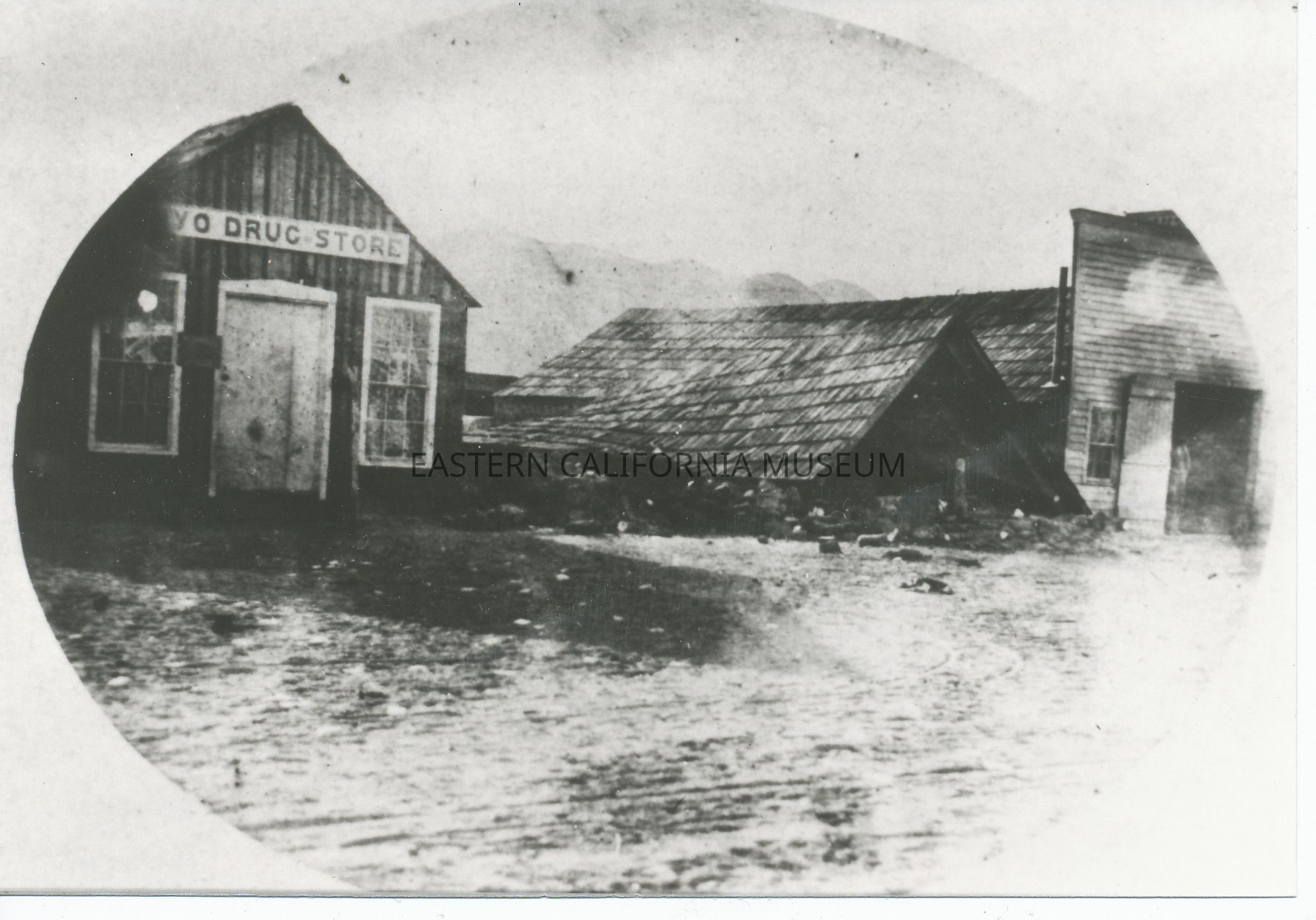 Damage done by the Earthquake of 1872. The photo shows the (In)yo Drug Store and another building (livery stable? blacksmith? warehouse?) flanking a collapsed building of which the roof is all that remains.