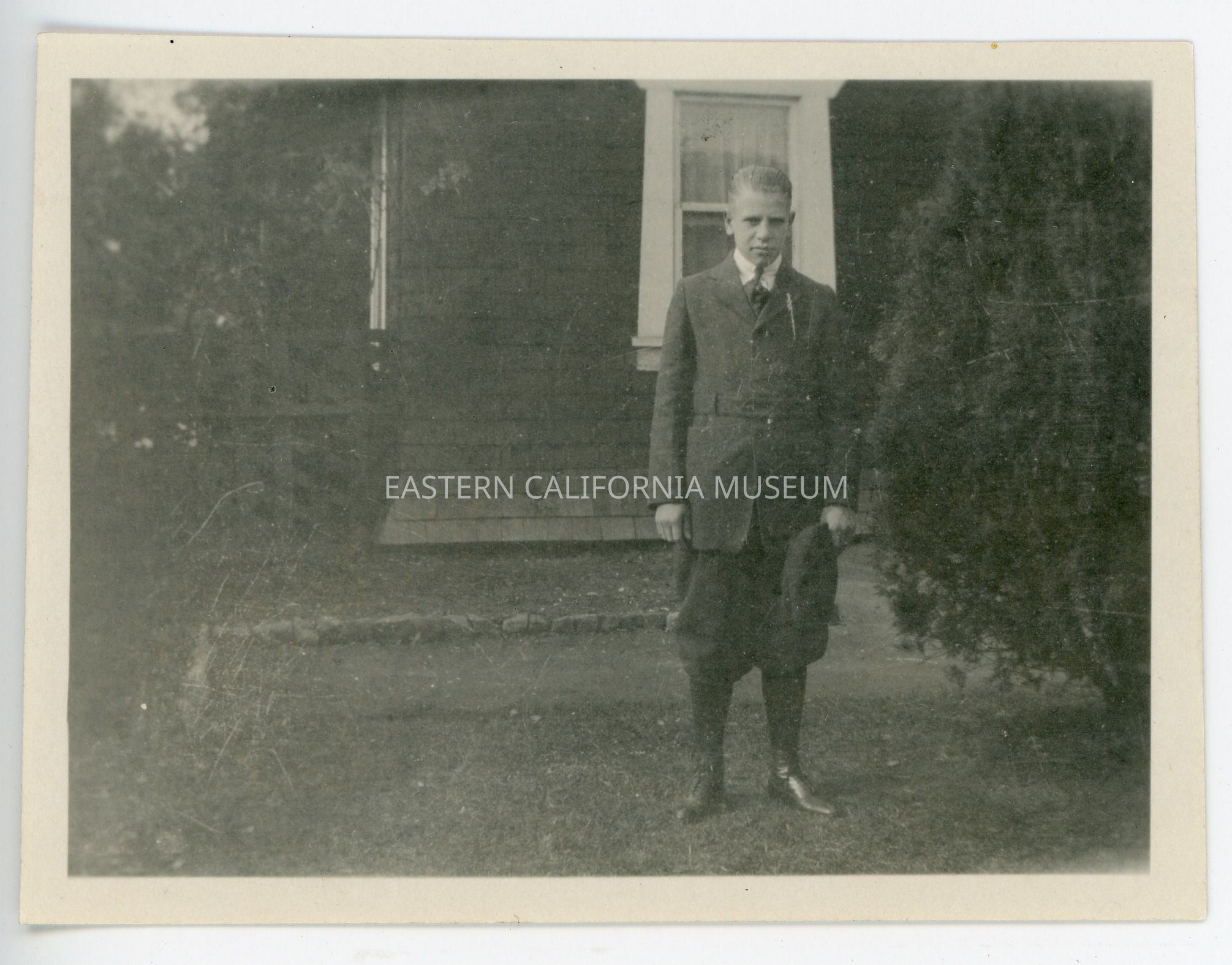 Small photo of a young ma wearing a uniform or costume standing in front of a house next to a (juniper?) bush. Looks very similiar to the location in 1968.32.18 in which Ray Maris is standing in front of a large juniper bush in his baseball uniform.