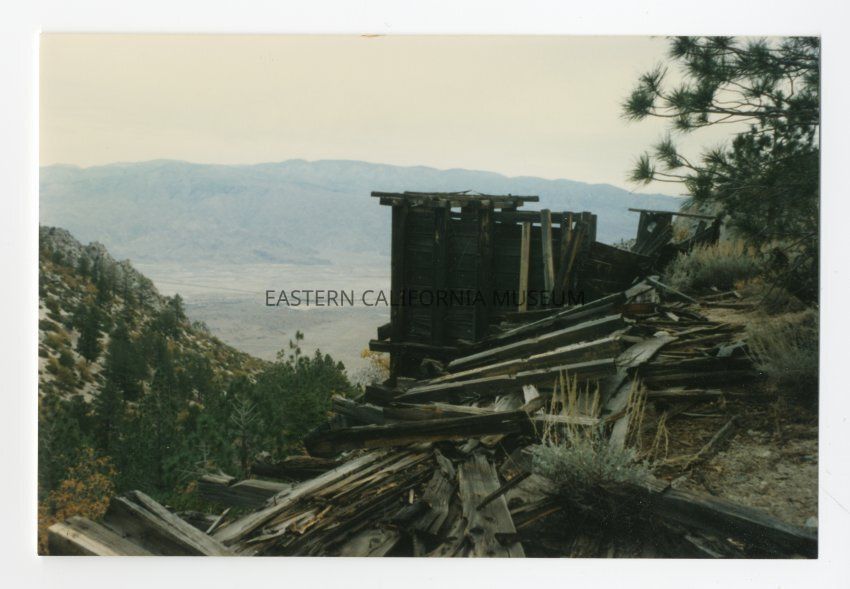 Color photograph of the ruins of a wooden sawmill in Sawmill Canyon.