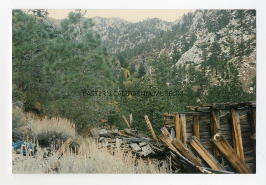 Color photograph of the ruins of a wooden sawmill in Sawmill Canyon.