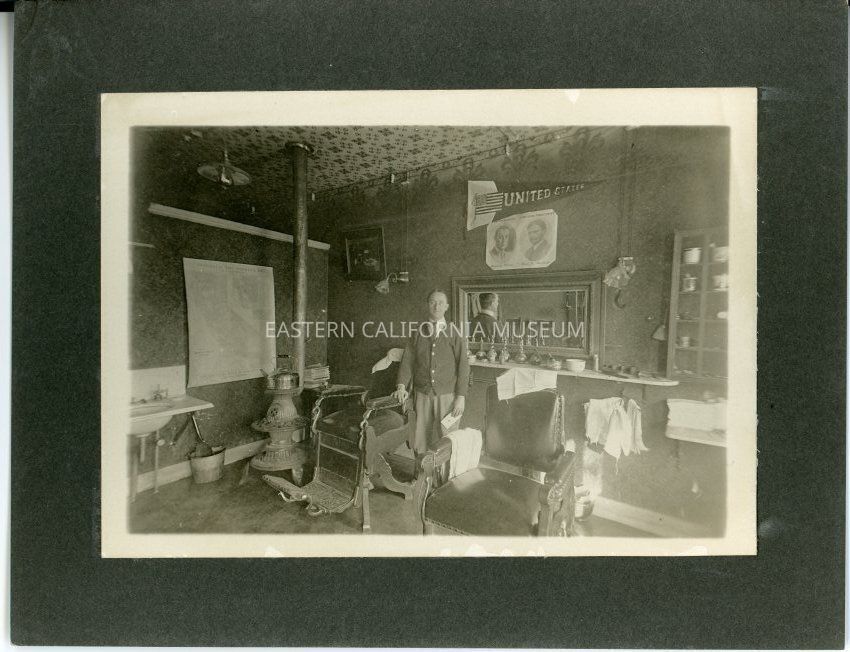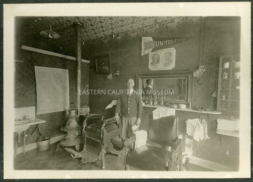 Mounted photo of the interior of a barber shop with a man, likely the owner, Max Fausel, standing in the middle. There is a pennant hanging on the wall that has the U.S. flag and says "United States." Below that is a poster of Woodrow Wilson for President and Thos R. Marshall for Vice President.