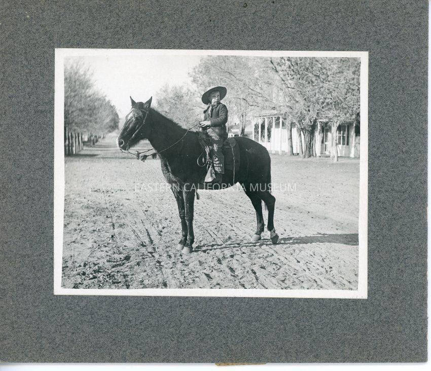 Mounted photo of a young boy on horseback in the middle of a dirt street. Houses and trees visible in background. Writing in pencil on back: "Leroy Roeper, Independence."